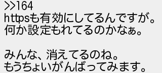 167: [sage] 2018/07/29(日) 21:51:57.49 ID:wSPJmB0A >>164 httpsも有効にしてるんですが。 何か設定もれてるのかなぁ。 みんな、消えてるのね。 もうちょいがんばってみます。 http://egg.5ch.net/test/read.cgi/android/1532561421/167