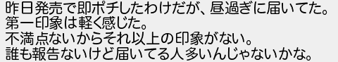 昨日発売で即ポチしたわけだが昼過ぎに届いてた 第一印象は軽く感じた 不満点ないからそれ以上の印象がない 誰も報告ないけど届いてる人多いんじゃないかな