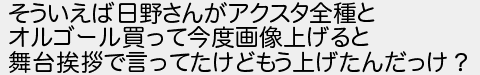 そういえば日野さんがアクスタ全種と オルゴール買って今度画像上げると 舞台挨拶で言ってたけどもう上げたんだっけ?