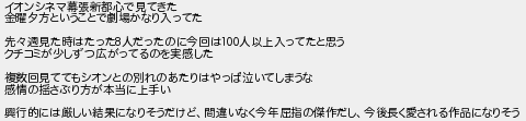 イオンシネマ幕張新都心で見てきた 金曜夕方ということで劇場かなり入ってた 先週見た時はたった人だったのに今回は人以上入ってたと思う クチコミが少しずつ広がってるのを実感した 複数回見ててもシオンとの別れのあたりはやっぱ泣いてしまうな 感情の揺さぶり方が本当に上手い 興行的には厳しい結果になりそうだけど間違いなく今年屈指の傑作だし今後長く愛される作品になりそう