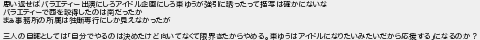 思い返せばバラエティー出演にしろアイドル企画にしろ東ゆうが強引に誘ったって描写は確かにないな バラエティーで西を説得したのは南だったか まぁ事務所の所属は独断専行にしか見えなかったが 三人の自認としては自分でやるのは決めたけど向いてなくて限界きたからやめる東ゆうはアイドルになりたいみたいだから応援するになるのか?