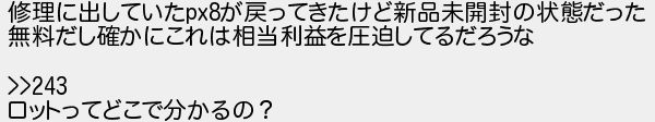 246: (ワッチョイW bf8e-BKgR) [sage] 2025/07/10(木) 18:11:32.65 ID:JQyIgyq20 修理に出していたpx8が戻ってきたけど新品未開封の状態だった 無料だし確かにこれは相当利益を圧迫してるだろうな >>243 ロットってどこで分かるの? http://mevius.5ch.io/test/read.cgi/av/1710261663/246