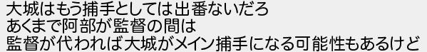 大城はもう捕手としては出番ないだろ あくまで阿部が監督の間は 監督が代われば大城がメイン捕手になる可能性もあるけど