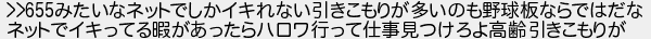 みたいなネットでしかイキれない引きこもりが多いのも野球板ならではだな ネットでイキってる暇があったらハロワ行って仕事見つけろよ高齢引きこもりが