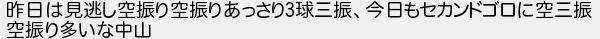 昨日は見逃し空振り空振りあっさり球三振今日もセカンドゴロに空三振 空振り多いな中山
