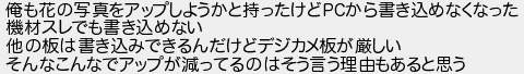 俺も花の写真をアップしようかと持ったけどから書き込めなくなった 機材スレでも書き込めない 他の板は書き込みできるんだけどデジカメ板が厳しい そんなこんなでアップが減ってるのはそう言う理由もあると思う