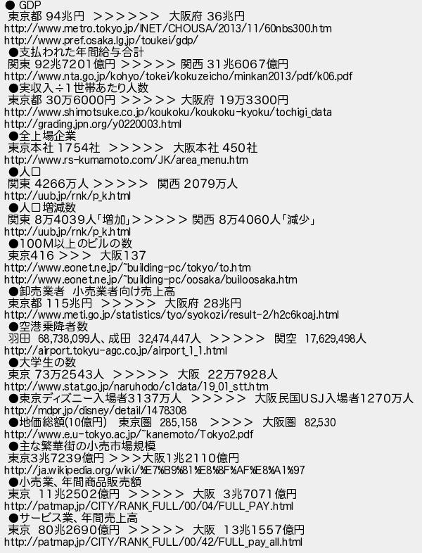 112: [sage] 2016/11/22(火) 15:15:32.43 ID:c0H7T3N2 ● GDP 東京都 94兆円 >>>>>> 大阪府 36兆円 http://www.metro.tokyo.jp/INET/CHOUSA/2013/11/60nbs300.htm http://www.pref.osaka.lg.jp/toukei/gdp/ ●支払われた年間給与合計 関東 92兆7201億円 >>>>> 関西 31兆6067億円 http://www.nta.go.jp/kohyo/tokei/kokuzeicho/minkan2013/pdf/k06.pdf ●実収入÷1世帯あたり人数 東京都 30万6000円 >>>>> 大阪府 19万3300円 http://www.shimotsuke.co.jp/koukoku/koukoku-kyoku/tochigi_data http://grading.jpn.org/y0220003.html ●全上場企業 東京本社 1754社 >>>>> 大阪本社 450社 http://www.rs-kumamoto.com/JK/area_menu.htm ●人口 関東 4266万人 >>>>> 関西 2079万人 http://uub.jp/rnk/p_k.html ●人口増減数 関東 8万4039人「増加」>>>>> 関西 8万4060人「減少」 http://uub.jp/rnk/p_k.html ●100M以上のビルの数 東京416 >>> 大阪137 http://www.eonet.ne.jp/~building-pc/tokyo/to.htm http://www.eonet.ne.jp/~building-pc/oosaka/builoosaka.htm ●卸売業者 小売業者向け売上高 東京都 115兆円 >>>>> 大阪府 28兆円 http://www.meti.go.jp/statistics/tyo/syokozi/result-2/h2c6koaj.html ●空港乗降者数 羽田 68,738,099人、成田 32,474,447人 >>>>> 関空 17,629,498人 http://airport.tokyu-agc.co.jp/airport_1_1.html ●大学生の数 東京 73万2543人 >>>>> 大阪 22万7928人 http://www.stat.go.jp/naruhodo/c1data/19_01_stt.htm ●東京ディズニー入場者3137万人 >>>>> 大阪民国USJ入場者1270万人 http://mdpr.jp/disney/detail/1478308 ●地価総額(10億円) 東京圏 285,158 >>>> 大阪圏 82,530 http://www.e.u-tokyo.ac.jp/~kanemoto/Tokyo2.pdf ●主な繁華街の小売市場規模 東京3兆7239億円 >>>大阪1兆2110億円 http://ja.wikipedia.org/wiki/%E7%B9%81%E8%8F%AF%E8%A1%97 ●小売業、年間商品販売額 東京 11兆2502億円 >>>>> 大阪 3兆7071億円 http://patmap.jp/CITY/RANK_FULL/00/04/FULL_PAY.html ●サービス業、年間売上高 東京 80兆2690億円 >>>>> 大阪 13兆1557億円 http://patmap.jp/CITY/RANK_FULL/00/42/FULL_pay_all.html http://egg.5ch.io/test/read.cgi/develop/1478895596/112