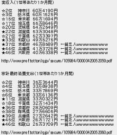 211: (芋) [] 2017/07/06(木) 00:14:35.71 ID:TxDUKRkN 実収入(1世帯あたり1か月間) ☆2位 神奈川 60万4190円 ☆3位 栃木県 60万1525円 ☆15位 東京都 56万1694円 ☆17位 埼玉県 55万8646円 ☆20位 茨城県 54万2549円 ★22位 滋賀県 53万3048円 ☆27位 千葉県 52万3397円 ★33位 和歌山 49万5275円 ★37位 京都府 46万8589円 ←貧乏人wwwwwwwwww ★44位 兵庫県 41万3726円 ←貧乏人wwwwwwwwww ★46位 大阪府 40万6338円 ←貧乏人wwwwwwwwww http://www.pref.tottori.lg.jp/secure/105984/00000420052059.pdf 家計最終消費支出(1世帯あたり1か月間) ☆2位 神奈川 35万3544円 ☆4位 埼玉県 33万8938円 ☆5位 栃木県 33万7869円 ☆6位 東京都 33万6136円 ★11位 滋賀県 33万0322円 ☆18位 千葉県 32万1434円 ★36位 京都府 28万0609円 ☆38位 群馬県 27万6605円 ★39位 兵庫県 27万2642円 ←貧乏人wwwwwwwwwwww ★45位 大阪府 26万1721円 ←貧乏人wwwwwwwwwwww ★46位 和歌山 25万3709円 ←貧乏人wwwwwwwwwwww http://www.pref.tottori.lg.jp/secure/105984/00000420052060.pdf http://egg.5ch.io/test/read.cgi/develop/1487473301/211