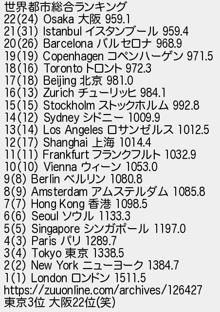 978: (catv?) [sage] 2018/11/08(木) 09:54:34.10 ID:iG+n5uh9 世界都市総合ランキング 22(24) Osaka 大阪 959.1 21(31) Istanbul イスタンブール 959.4 20(26) Barcelona バルセロナ 968.9 19(19) Copenhagen コペンハーゲン 971.5 18(16) Toronto トロント 972.3 17(18) Beijing 北京 981.0 16(13) Zurich チューリッヒ 984.1 15(15) Stockholm ストックホルム 992.8 14(12) Sydney シドニー 1009.9 13(14) Los Angeles ロサンゼルス 1012.5 12(17) Shanghai 上海 1014.4 11(11) Frankfurt フランクフルト 1032.9 10(10) Vienna ウィーン 1053.0 9(8) Berlin ベルリン 1080.8 8(9) Amsterdam アムステルダム 1085.8 7(7) Hong Kong 香港 1098.5 6(6) Seoul ソウル 1133.3 5(5) Singapore シンガポール 1197.0 4(3) Paris パリ 1289.7 3(4) Tokyo 東京 1338.5 2(2) New York ニューヨーク 1384.7 1(1) London ロンドン 1511.5 https://zuuonline.com/archives/126427 東京3位 大阪22位(笑) http://egg.5ch.io/test/read.cgi/develop/1492269557/978