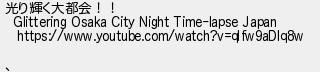 490: (茸) [] 2017/09/15(金) 22:13:13.50 ID:aAbyyCt2 光り輝く大都会!! Glittering Osaka City Night Time-lapse Japan https://www.youtube.com/watch?v=qIfw9aDlq8w 、 http://egg.5ch.io/test/read.cgi/develop/1503924463/490
