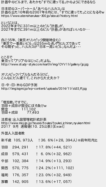 計画中のビルまであたかもすでに建ってるかのようにできるなら 日本初のスーパートールあべのハルカスは 計画の出た10年前の2007年8月にはすでに建ってたことになるぞ ということは 2022年までに331以上のビル計画が 2027年までに391以上のビル計画があればいいのか 向こう5年東京オリンピック開催時含む 東京で一番高いビルは255の虎ノ門ヒルズであって その間ずっとハルカスが日本一高いビルなんだよ ところで 東京ってアジアのはじっこだよな オリンピックバブルなんだろうけど こんなにビル建ててこれから大丈夫か? 日中印米の予測 増加数ですでに 羽田成田が関空にぼろ負け 関空 111102 羽田成田 77493 法務省出入国管理統計統計表 2017 9月 速報値1025公表 外国人入国者数 新千歳 105973人 36628394人前年同月比 羽田 294291 17844521 成田 579431 6032962 中部 102384 14913293 関西 570775 242111102 福岡 176357 23032949 那覇 142905 13617057