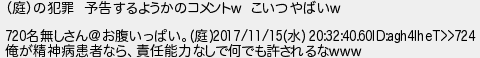 44: (チベット自治区) [] 2017/11/15(水) 20:49:34.22 ID:WQwGfVQH (庭)の犯罪 予告するようかのコメントw こいつやばいw 720名無しさん@お腹いっぱい。(庭)2017/11/15(水) 20:32:40.60ID:agh4IheT>>724 俺が精神病患者なら、責任能力なしで何でも許されるなwww http://egg.5ch.io/test/read.cgi/develop/1510240083/44