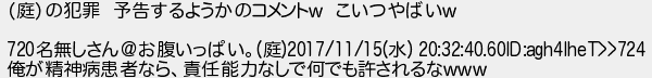44: (チベット自治区) [] 2017/11/15(水) 20:49:34.22 ID:WQwGfVQH (庭)の犯罪 予告するようかのコメントw こいつやばいw 720名無しさん@お腹いっぱい。(庭)2017/11/15(水) 20:32:40.60ID:agh4IheT>>724 俺が精神病患者なら、責任能力なしで何でも許されるなwww http://egg.5ch.io/test/read.cgi/develop/1510240083/44