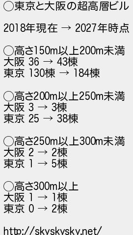 562: (禿) [] 2018/07/03(火) 09:45:13 ID:KltD68dK ◯東京と大阪の超高層ビル 2018年現在 → 2027年時点 ◯高さ150m以上200m未満 大阪 36 → 43棟 東京 130棟 → 184棟 ◯高さ200m以上250m未満 大阪 3 → 3棟 東京 25 → 38棟 ◯高さ250m以上300m未満 大阪 2 → 2棟 東京 1 → 5棟 ◯高さ300m以上 大阪 1 → 1棟 東京 0 → 2棟 http://skyskysky.net/ http://egg.5ch.io/test/read.cgi/develop/1519183296/562
