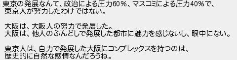 東京の発展なんて政治による圧力マスコミによる圧力で 東京人が努力したわけではない 大阪は大阪人の努力で発展した 大阪は他人のふんどしで発展した都市に魅力を感じないし眼中にない 東京人は自力で発展した大阪にコンプレックスを持つのは 歴史的に自然な感情なんだろうね