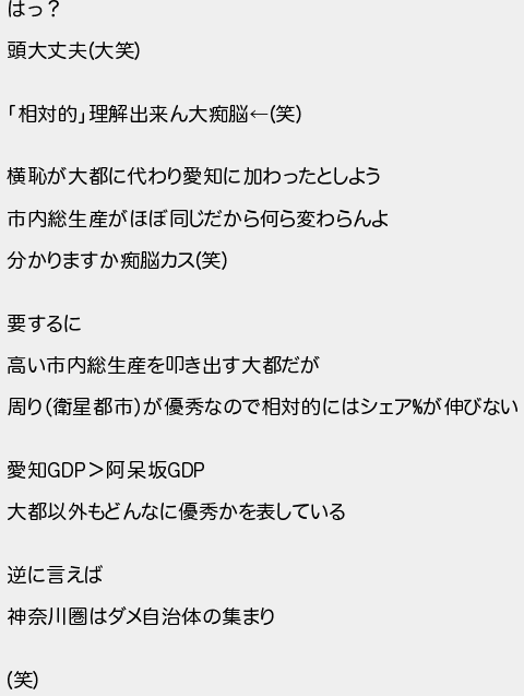 はっ? 頭大丈夫大笑 相対的理解出来ん大痴脳笑 横恥が大都に代わり愛知に加わったとしよう 市内総生産がほぼ同じだから何ら変わらんよ 分かりますか痴脳カス笑 要するに 高い市内総生産を叩き出す大都だが 周り衛星都市が優秀なので相対的にはシェアが伸びない 愛知阿呆坂 大都以外もどんなに優秀かを表している 逆に言えば 神奈川圏はダメ自治体の集まり 笑