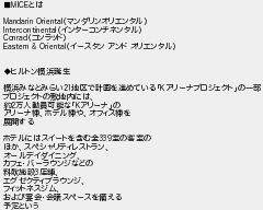 85: (ジパング) [sage] 2022/08/30(火) 12:00:06.98 ID:3RUTcRX8 ■MICEとは Mandarin Oriental(マンダリンオリエンタル) Intercontinental(インターコンチネンタル) Conrad(コンラッド) Eastern & Oriental(イースタン アンド オリエンタル) ◆ヒルトン横浜誕生 横浜みなとみらい21地区で計画を進めている「Kアリーナプロジェクト」の一部 プロジェクトの敷地内には、 約2万人動員可能な「Kアリーナ」の アリーナ棟、ホテル棟や、オフィス棟を 展開する ホテルにはスイートを含む全339室の客室の ほか、スペシャリティレストラン、 オールデイダイニング、 カフェ・バーラウンジなどの 料飲施設3店舗、 エグゼクティブラウンジ、 フィットネスジム、 および宴会・会議スペースを備える 予定という http://egg.5ch.io/test/read.cgi/develop/1661238107/85