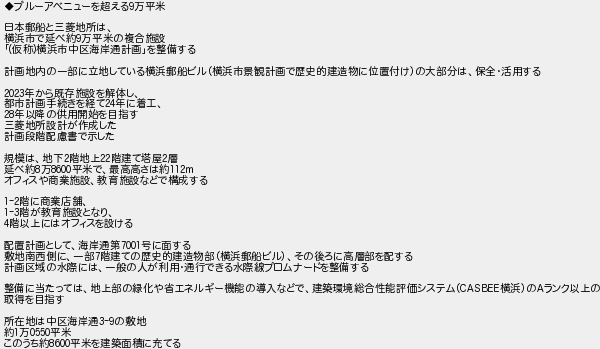 ブルーアベニューを超える万平米 日本郵船と三菱地所は 横浜市で延べ約万平米の複合施設 仮称横浜市中区海岸通計画を整備する 計画地内の一部に立地している横浜郵船ビル横浜市景観計画で歴史的建造物に位置付けの大部分は保全活用する 年から既存施設を解体し 都市計画手続きを経て年に着工 年以降の供用開始を目指す 三菱地所設計が作成した 計画段階配慮書で示した 規模は地下階地上階建て塔屋層 延べ約万平米で最高高さは約 オフィスや商業施設教育施設などで構成する 階に商業店舗 階が教育施設となり 階以上にはオフィスを設ける 配置計画として海岸通第号に面する 敷地南西側に一部階建ての歴史的建造物部横浜郵船ビルその後ろに高層部を配する 計画区域の水際には一般の人が利用通行できる水際線プロムナードを整備する 整備に当たっては地上部の緑化や省エネルギー機能の導入などで建築環境総合性能評価システム横浜のランク以上の 取得を目指す 所在地は中区海岸通の敷地 約万平米 このうち約平米を建築面積に充てる