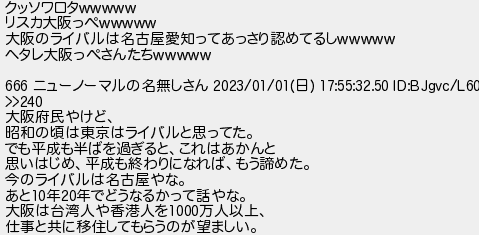 クッソワロタ リスカ大阪っぺ 大阪のライバルは名古屋愛知ってあっさり認めてるし ヘタレ大阪っぺさんたち ニューノーマルの名無しさん 日 大阪府民やけど 昭和の頃は東京はライバルと思ってた でも平成も半ばを過ぎるとこれはあかんと 思いはじめ平成も終わりになればもう諦めた 今のライバルは名古屋やな あと年年でどうなるかって話やな 大阪は台湾人や香港人を万人以上 仕事と共に移住してもらうのが望ましい