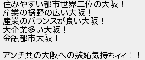 住みやすい都市世界二位の大阪! 産業の裾野の広い大阪! 産業のバランスが良い大阪! 大企業多い大阪! 金融都市大阪! アンチ共の大阪への嫉妬気持ちィィ!!