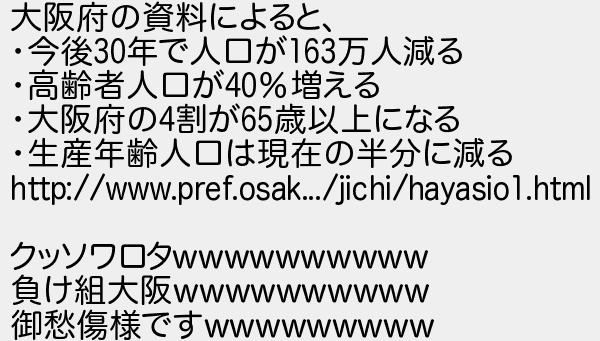 大阪府の資料によると 今後年で人口が万人減る 高齢者人口が増える 大阪府の割が歳以上になる 生産年齢人口は現在の半分に減る クッソワロタ 負け組大阪 御愁傷様です