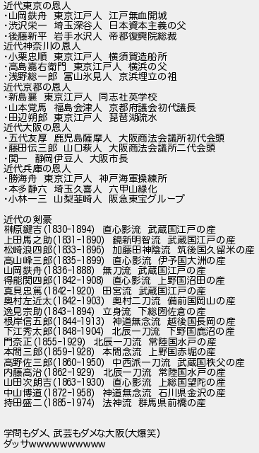 近代東京の恩人 山岡鉄舟 東京江戸人 江戸無血開城 渋沢栄一 埼玉深谷人 日本資本主義の父 後藤新平 岩手水沢人 帝都復興院総裁 近代神奈川の恩人 小栗忠順 東京江戸人 横須賀造船所 高島嘉右衛門 東京江戸人 横浜の父 浅野総一郎 富山氷見人 京浜埋立の祖 近代京都の恩人 新島 東京江戸人 同志社英学校 山本覚馬 福島会津人 京都府議会初代議長 田辺朔郎 東京江戸人 琵琶湖疏水 近代大阪の恩人 五代友厚 鹿児島薩摩人 大阪商法会議所初代会頭 藤田伝三郎 山口萩人 大阪商法会議所二代会頭 関一 静岡伊豆人 大阪市長 近代兵庫の恩人 勝海舟 東京江戸人 神戸海軍操練所 本多静六 埼玉久喜人 六甲山緑化 小林一三 山梨韮崎人 阪急東宝グループ 近代の剣豪 榊原鍵吉 直心影流 武蔵国江戸の産 上田馬之助 鏡新明智流 武蔵国江戸の産 松崎浪四郎 加藤田神陰流 筑後国久留米の産 高山峰三郎 直心影流 伊予国大洲の産 山岡鉄舟 無刀流 武蔵国江戸の産 得能関四郎 直心影流 上野国沼田の産 真貝忠篤 田宮流 武蔵国江戸の産 奥村左近太 奥村二刀流 備前国岡山の産 逸見宗助 立身流 下総佐倉の産 根岸信五郎 神道無念流 越後国長岡の産 下江秀太郎 北辰一刀流 下野国鹿沼の産 門奈正 北辰一刀流 常陸国水戸の産 本間三郎 本間念流 上野国赤堀の産 高野佐三郎 中西派一刀流 武蔵国秩父の産 内藤高治 北辰一刀流 常陸国水戸の産 山田次朗吉 直心影流 上総国望陀の産 中山博道 神道無念流 石川県金沢の産 持田盛二 法神流 群馬県前橋の産 学問もダメ武芸もダメな大阪大爆笑 ダッサ