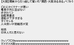 671: (東京都) [sage] 2023/01/08(日) 14:05:11.31 ID:TOHcMqL6 【大阪】関東から引っ越して驚いた「関西・大阪あるある」ベスト5 ○とにかくマナーが悪い 電車の列に並ばない 歩きタバコ 自転車暴走 運転が下手すぎる すぐキレる 人は良いが距離感が変 総括 日本人だと思えない クッソワロタwwwwwwwwwwwwwwwwwwwwwwwww ダメダメ大阪wwwwwwwwwwwwwwwwwwwwwwwww http://egg.5ch.io/test/read.cgi/develop/1672907985/671