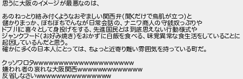 思うに大阪のイメージが最悪なのは あのねっとり絡み付くようなおぞましい関西弁聞くだけで鳥肌が立つと 儲かりまっかぼちぼちでんなが日常会話のナニワ商人の守銭奴っぷりや ドブ川に喜として身投げをする先進国民とは到底思えない行動様式や ジャンクフードお好み焼きをおかずに白飯を食べる味覚異常な食生活をしていることに 起因しているんだと思う 確かに多くの日本人にとってはちょっと近寄り難い雰囲気を持っている町だ クッソワロタ 嫌われ者の哀れな大阪関西 反省しなさい