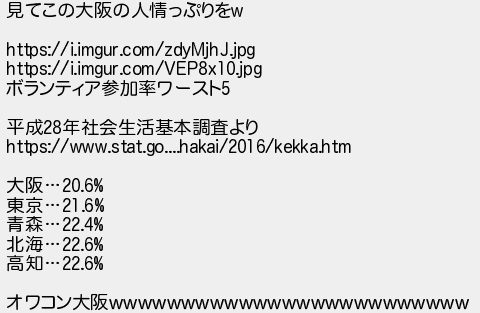 780: (東京都) [sage] 2023/01/10(火) 12:03:44.23 ID:K5gRPgGM 見てこの大阪の人情っぷりをw https://i.imgur.com/zdyMjhJ.jpg https://i.imgur.com/VEP8x10.jpg ボランティア参加率ワースト5 平成28年社会生活基本調査より https://www.stat.go....hakai/2016/kekka.htm 大阪…20.6% 東京…21.6% 青森…22.4% 北海…22.6% 高知…22.6% オワコン大阪wwwwwwwwwwwwwwwwwwwwwwwww http://egg.5ch.io/test/read.cgi/develop/1672907985/780