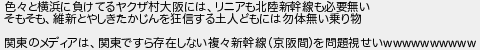 色と横浜に負けてるヤクザ村大阪にはリニアも北陸新幹線も必要無い そもそも維新とやしきたかじんを狂信する土人どもには勿体無い乗り物 関東のメディアは関東ですら存在しない複新幹線京阪間を問題視せい