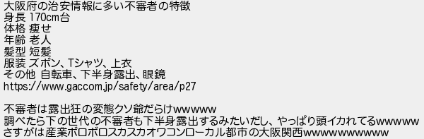 大阪府の治安情報に多い不審者の特徴 身長 台 体格 痩せ 年齢 老人 髪型 短髪 服装 ズボンシャツ上衣 その他 自転車下半身露出眼鏡 不審者は露出狂の変態クソ爺だらけ 調べたら下の世代の不審者も下半身露出するみたいだしやっぱり頭イカれてる さすがは産業ボロボロスカスカオワコンローカル都市の大阪関西