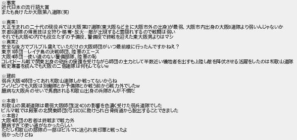 事実 近代日本の流行語大賞 またも負けたか大阪第八連隊笑 真実 大正生まれの二十代の現役兵では大阪第連隊東大阪など主に大阪市外の出身が最弱大阪市内出身の大阪連隊より弱いんじゃないか 京都連隊の得意技は女狩り略奪放火敵が出現すると雲隠れするので戦闘は弱い それでも大阪内でも役立たずの予備役警備役で終戦を迎えた東大阪男よりはマシ 真実 安全な後方でブルブル震えていただけの大阪師団がいつ最前線に行ったんですかねえ? 東京師団レイテ島の決戦師団陸軍のエース 大阪師団使い道のない警備部隊陸軍の恥 コレヒドール戦で関東出身の砲兵の援護を受けながら師団の主力として半数近い犠牲者を出すも上陸し敵を降伏させる活躍をしたのは和歌山連隊 戦史叢書を読んでも大阪の二個連隊は何もしてない 建前 弱兵大阪師団ってあれ和歌山連隊しか戦ってないからね フィリピンでも大阪は別働隊とか予備隊とか戦う前から戦力外でした 臆病な大阪兵のせいで馬鹿される和歌山出身の兵隊さんが不だ 本音 和歌山の黒潮連隊は最弱大阪師団淀の影響を色濃く受けた弱兵連隊でした ビルマ戦では殿軍の北関東師団弓に助けられ白骨街道から脱出することできました 本音 大阪師団の若者は終戦まで戦力外 臆病すぎて使い道がなかったらしい ただし和歌山の部隊の一部はビルマに送られ英印軍と戦ったよ 弱かったけどね