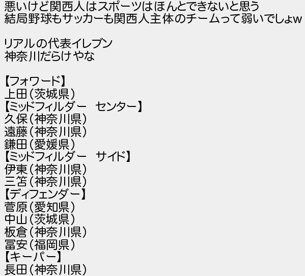 悪いけど関西人はスポーツはほんとできないと思う 結局野球もサッカーも関西人主体のチームって弱いでしょ リアルの代表イレブン 神奈川だらけやな フォワード 上田茨城県 ミッドフィルダー センター 久保神奈川県 遠藤神奈川県 鎌田愛媛県 ミッドフィルダー サイド 伊東神奈川県 三神奈川県 ディフェンダー 菅原愛知県 中山茨城県 板倉神奈川県 冨安福岡県 キーパー 長田神奈川県