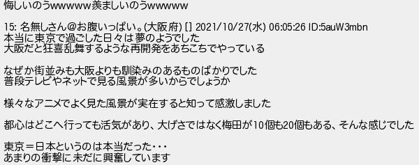 562: (庭) [sage] 2023/11/13(月) 14:48:01.43 ID:g8byIBbM 悔しいのうwwwww羨ましいのうwwwww 15: 名無しさん@お腹いっぱい。(大阪府) [] 2021/10/27(水) 06:05:26 ID:5auW3mbn 本当に東京で過ごした日々は夢のようでした 大阪だと狂喜乱舞するような再開発をあちこちでやっている なぜか街並みも大阪よりも馴染みのあるものばかりでした 普段テレビやネットで見る風景が多いからでしょうか 様々なアニメでよく見た風景が実在すると知って感激しました 都心はどこへ行っても活気があり、大げさではなく梅田が10個も20個もある、そんな感じでした 東京=日本というのは本当だった・・・ あまりの衝撃に未だに興奮しています http://egg.5ch.io/test/read.cgi/develop/1699601653/562