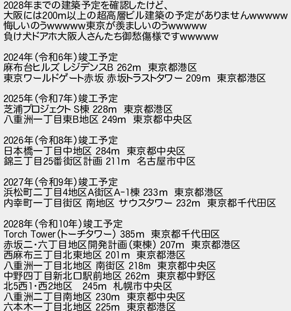 331: ころころ(庭) [] 2024/04/28(日) 13:56:45.90 ID:Ryyy7PAq 2028年までの建築予定を確認したけど、 大阪には200m以上の超高層ビル建築の予定がありませんwwwww 悔しいのうwwwww東京が羨ましいのうwwwww 負け犬ドアホ大阪人さんたち御愁傷様ですwwwww 2024年(令和6年)竣工予定 麻布台ヒルズ レジデンスB 262m 東京都港区 東京ワールドゲート赤坂 赤坂トラストタワー 209m 東京都港区 2025年(令和7年)竣工予定 芝浦プロジェクト S棟 228m 東京都港区 八重洲一丁目東B地区 249m 東京都中央区 2026年(令和8年)竣工予定 日本橋一丁目中地区 284m 東京都中央区 錦三丁目25番街区計画 211m 名古屋市中区 2027年(令和9年)竣工予定 浜松町二丁目4地区A街区A-1棟 233m 東京都港区 内幸町一丁目街区 南地区 サウスタワー 232m 東京都千代田区 2028年(令和10年)竣工予定 Torch Tower(トーチタワー) 385m 東京都千代田区 赤坂二・六丁目地区開発計画(東棟) 207m 東京都港区 西麻布三丁目北東地区 201m 東京都港区 八重洲一丁目北地区 南街区 218m 東京都中央区 中野四丁目新北口駅前地区 262m 東京都中野区 北5西1・西2地区 245m 札幌市中央区 八重洲二丁目南地区 230m 東京都中央区 六本木一丁目北地区 225m 東京都港区 http://egg.5ch.io/test/read.cgi/develop/1711552041/331