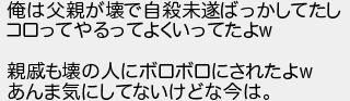 俺は父親が壊で自殺未遂ばっかしてたし コロってやるってよくいってたよ 親戚も壊の人にボロボロにされたよ あんま気にしてないけどな今は