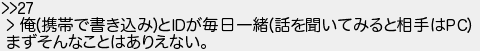 28: [sage] 2008/09/06(土) 00:44:45 ID:??? >>27 > 俺(携帯で書き込み)とIDが毎日一緒(話を聞いてみると相手はPC) まずそんなことはありえない。 http://pc11.5ch.io/test/read.cgi/hack/1219928849/28
