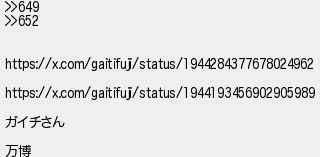 653: [sage] 2025/07/14(月) 00:58:32.03 ID:0 >>649 >>652 https://x.com/gaitifuji/status/1944284377678024962 https://x.com/gaitifuji/status/1944193456902905989 ガイチさん 万博 http://medaka.5ch.net/test/read.cgi/honobono/1751782770/653