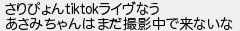 855: [sage] 2023/02/09(木) 17:41:19.15 ID:CtteTB+Z さりぴょんtiktokライヴなう あさみちゃんはまだ撮影中で来ないな http://fate.5ch.io/test/read.cgi/idol/1666831721/855