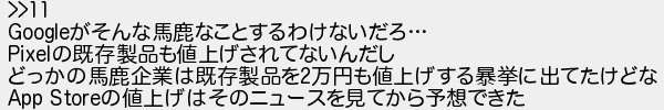 14: [sage] 2022/09/22(木) 16:02:09.07 ID:DWGNPoAF >>11 Googleがそんな馬鹿なことするわけないだろ… Pixelの既存製品も値上げされてないんだし どっかの馬鹿企業は既存製品を2万円も値上げする暴挙に出てたけどな App Storeの値上げはそのニュースを見てから予想できた http://fate.5ch.io/test/read.cgi/ios/1663649161/14