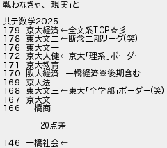 戦わなきゃ現実と 共テ数学2025 179 京大経済全文系 178 東大文二断念二部リーグ笑 176 東大文一 172 京大人健京大理系ボーダー 171 京大教育 170 阪大経済 一橋経済後期含む 169 京大法 168 東大文三東大全学部ボーダー笑 167 京大文 166 一橋商 点差 146 一橋社会