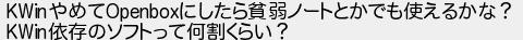 653: [sage] 2016/04/08(金) 01:30:59.79 ID:cWfF5fUW KWinやめてOpenboxにしたら貧弱ノートとかでも使えるかな? KWin依存のソフトって何割くらい? http://mao.5ch.net/test/read.cgi/linux/1224906972/653