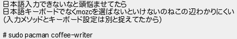 309: [sage] 2020/03/24(火) 14:28:16 ID:kYPkUn8u 日本語入力できないなと頭悩ませてたら 日本語キーボードでなくmozcを選ばないといけないのねこの辺わかりにくい (入力メソッドとキーボード設定は別と捉えてたから) # sudo pacman coffee-writer http://mao.5ch.io/test/read.cgi/linux/1568434521/309
