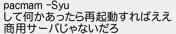 33: [sage] 2019/10/08(火) 11:17:37 ID:APPmgGL/ pacmam -Syu して何かあったら再起動すればええ 商用サーバじゃないだろ http://mao.5ch.io/test/read.cgi/linux/1568434521/33