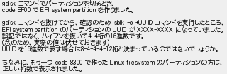 656: [sage] 2020/12/11(金) 22:33:02 ID:EmoVCwE1 gdisk コマンドでパーティションを切るとき、 code EF00 で EFI system partition を作りました。 gdisk コマンドを抜けてから、確認のため lsblk -o +UUID コマンドを実行したところ、 EFI system partition のパーティションの UUID が XXXX-XXXX になっていました。 誤記ではなく、ハイフンを抜いて4-4桁の16進数です。 (念のため、実際の値は伏せておきます) UUID を16進数で表す場合は8-4-4-4-12桁と決まっているのではないでしょうか。 ちなみに、もう一つ code 8300 で作った Linux filesystem のパーティションの方は、 正しい桁数で表示されました。 http://mao.5ch.io/test/read.cgi/linux/1568434521/656