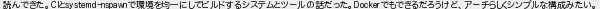 84: [sage] 2019/11/13(水) 15:20:37 ID:x+WfDomI 読んできた。CIとsystemd-nspawnで環境を均一にしてビルドするシステムとツールの話だった。Dockerでもできるだろうけど、アーチらしくシンプルな構成みたい。 http://mao.5ch.io/test/read.cgi/linux/1568434521/84