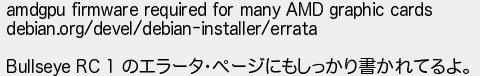 653: [sage] 2021/04/25(日) 18:44:19 ID:7VwEVpOx amdgpu firmware required for many AMD graphic cards debian.org/devel/debian-installer/errata Bullseye RC 1 のエラータ・ページにもしっかり書かれてるよ。 http://mao.5ch.net/test/read.cgi/linux/1606619383/653