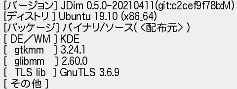 567: [] 2021/04/13(火) 13:55:17.79 ID:Hghs0VHx [バージョン] JDim 0.5.0-20210411(git:c2cef9f78b:M) [ディストリ ] Ubuntu 19.10 (x86_64) [パッケージ] バイナリ/ソース( <配布元> ) [ DE/WM ] KDE [ gtkmm ] 3.24.1 [ glibmm ] 2.60.0 [ TLS lib ] GnuTLS 3.6.9 [ その他 ] http://mao.5ch.io/test/read.cgi/linux/1609000121/567