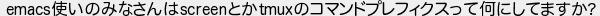 653: [sage] 2024/04/04(木) 23:50:16.27 ID:MXRijAo2 emacs使いのみなさんはscreenとかtmuxのコマンドプレフィクスって何にしてますか? http://mao.5ch.net/test/read.cgi/linux/1677228420/653