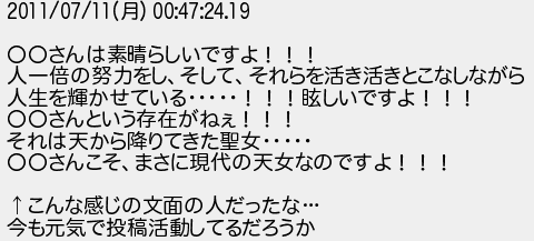 653: [sage] 2026/04/03(金) 10:40:29.15 ID:??? 2011/07/11(月) 00:47:24.19 〇〇さんは素晴らしいですよ!!! 人一倍の努力をし、そして、それらを活き活きとこなしながら 人生を輝かせている・・・・・!!!眩しいですよ!!! 〇〇さんという存在がねぇ!!! それは天から降りてきた聖女・・・・・ 〇〇さんこそ、まさに現代の天女なのですよ!!! ↑こんな感じの文面の人だったな… 今も元気で投稿活動してるだろうか http://rio2016.5ch.io/test/read.cgi/model/1768049325/653